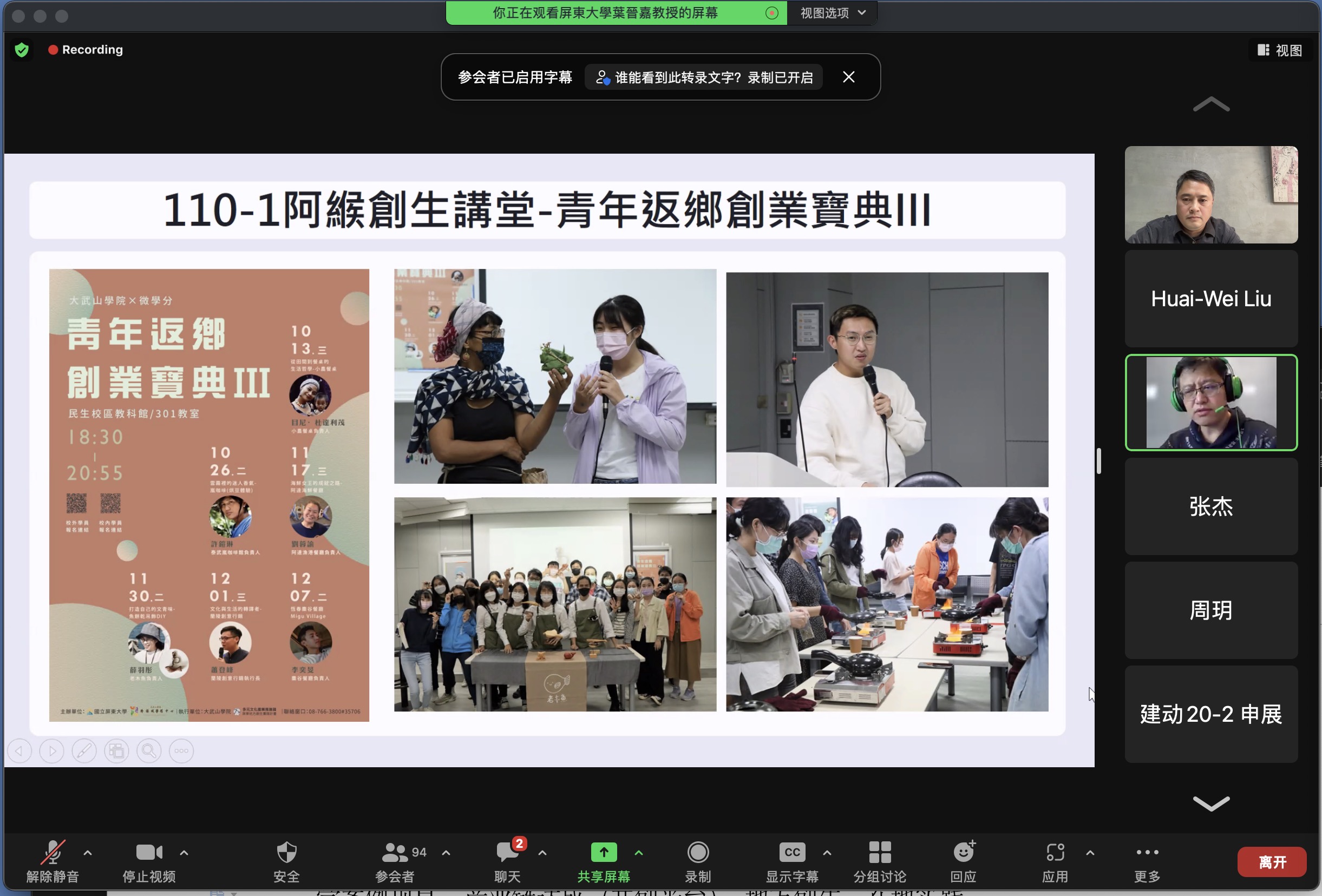 此次活动特邀台湾屏东大学刘怀帏、叶晋嘉两位老师进行线上专题交流。刘怀帏老师做了《地方振兴需要的新媒体数位行销方式》的交流,以新媒体、管理学和电子商务视角解读网络助力乡村振兴的具体实施路径。叶晋嘉老师做了《乡村振兴背景下从艺术的角度出发如何确立研究方向与方法》的交流,以教学案例项目、产业链达成(共创平台)、地方文创、在地实践做了专业讲解,并且在高校输出知识和技术方面表现出高校和高校教师的社会担当。