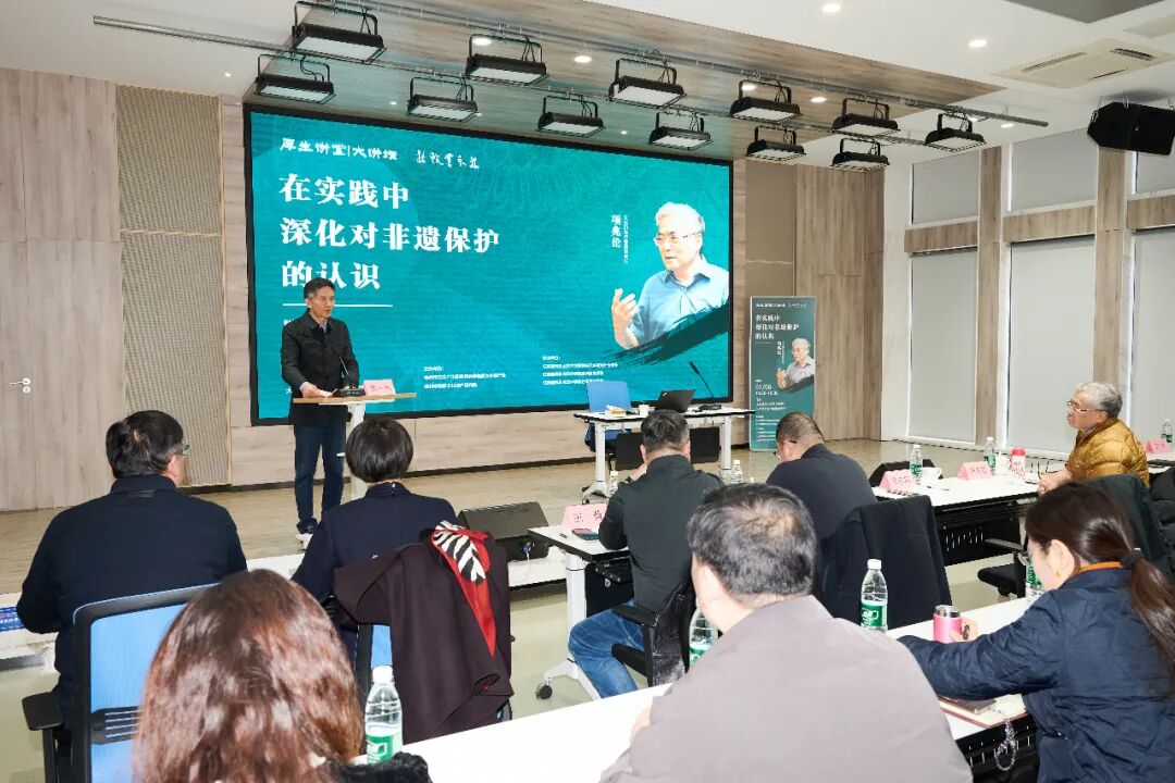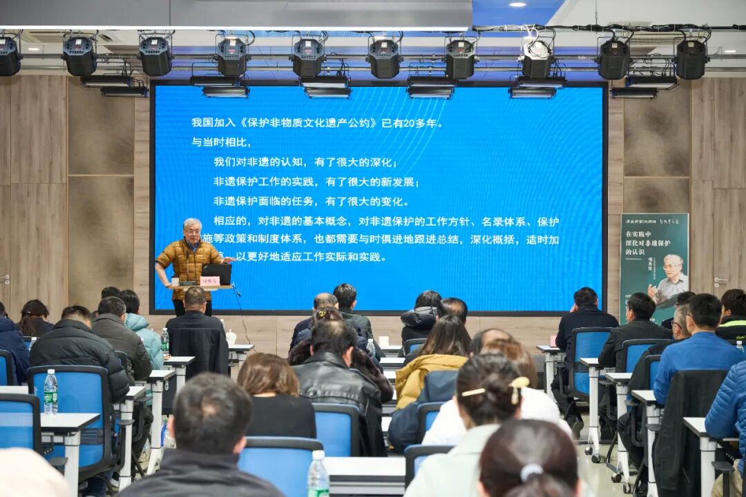 项兆伦作了题为《在实践中深化对非遗保护的认识》的专题讲座。他围绕“用整体观、发展观、实践观看非遗”及“人类非遗代表作名录申报”展开系统阐述,指出非遗是“活态文化遗产”,强调“见人、见物、见生活”的保护理念,并重申以习近平新时代中国特色社会主义思想为指导,推动非遗与现代生活相融合。他还回顾了“中国非遗传承人群研修研习培训计划”的实施历程,肯定高校在非遗传承中的学术支撑作用项兆伦先生还分享了我国在传承人研培与振兴传统工艺方面的实践经验与基本思路。
