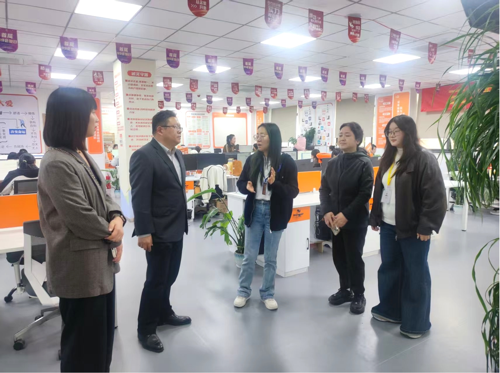 最后,方升一行走访江苏悦沐音创传媒科技有限公司。该公司是省级科技型中小企业、高新技术企业,专注音像制作、网络文化经营、品牌设计等业务,与广告艺术设计专业高度契合。通过与企业导师、实习生一对一沟通,全面了解实习任务完成情况及岗位适应度。企业负责人反馈,实习生在视觉设计、内容创意等岗位表现突出,希望后续深化合作,吸纳更多优秀毕业生入职。双方还就人才需求标准、实习考核机制等进行对接,为毕业生争取更多优质就业机会。